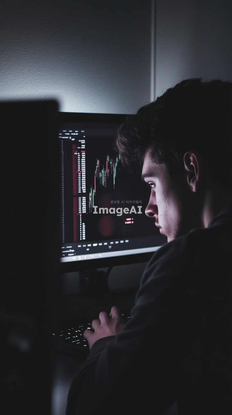 어두운 방 안에서 컴퓨터 화면을 바라보며 아쉬워하는 젊은 남성, 화면에는 급등하는 코인 차트가 표시되어 있음, 남성의 표정은 아쉬움과 후회가 섞인 복잡한 감정, 방 안에는 차가운 조명 아래에서 반사되는 화면 빛이 남성의 얼굴을 비추고 있음