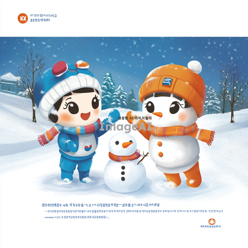 한국가스안전공사 캐릭터 '안전이'와 '행복이'가 겨울철 목도리를 메고 눈사람을 만드는 모습. 눈을 굴리고 있다