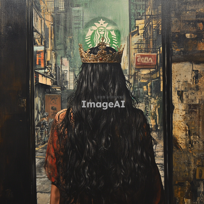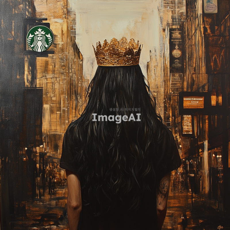 스타벅스로 들어가고 있는 예수, 긴 검은 머리를 가진 그녀는 화려한 왕관을 쓰고 있으며, 주변은 현대의 도시 모습, . 예수의 뒷모습이 보이고 스타벅스의 간판이 보인다.