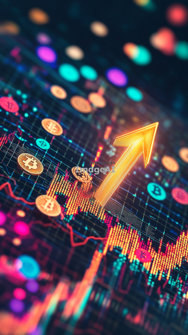 암호화폐가 급등하는 모습을 표현한 그래프, 차트 배경에 빛나는 금색 화살표가 위로 향하며 상승하는 모습, 다채로운 색상의 코인 아이콘들이 그래프 주변에 흩어져 있는 모습, 경제적 성장과 성공을 상징하는 이미지.