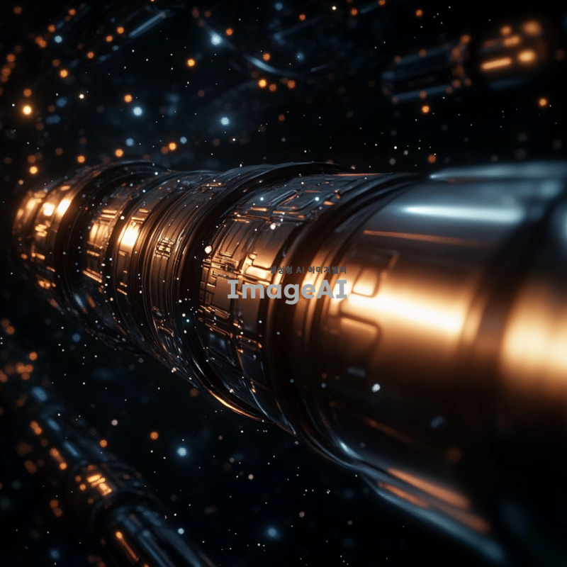 어두운 배경에 별빛이 반짝이는 우주 공간, 차가운 공허함이 느껴지는 분위기. 서서히 카메라가 이동하며 거대한 원통형 구조물이 등장하는 장면, 구조물은 금속성 재질로 빛을 반사하며 신비로운 느낌을 줌.