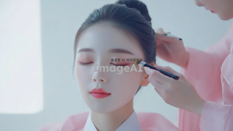 메이크업 아티스트에게 메이크업 받고 있는 젊은 한국 여성, 배경톤 화이트, 뒤에 메이크업 제품들이 배경으로 보임, 여성은 쉬폰 소재 분홍색 옷 입음