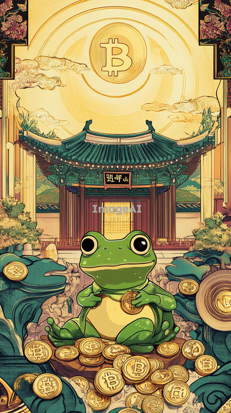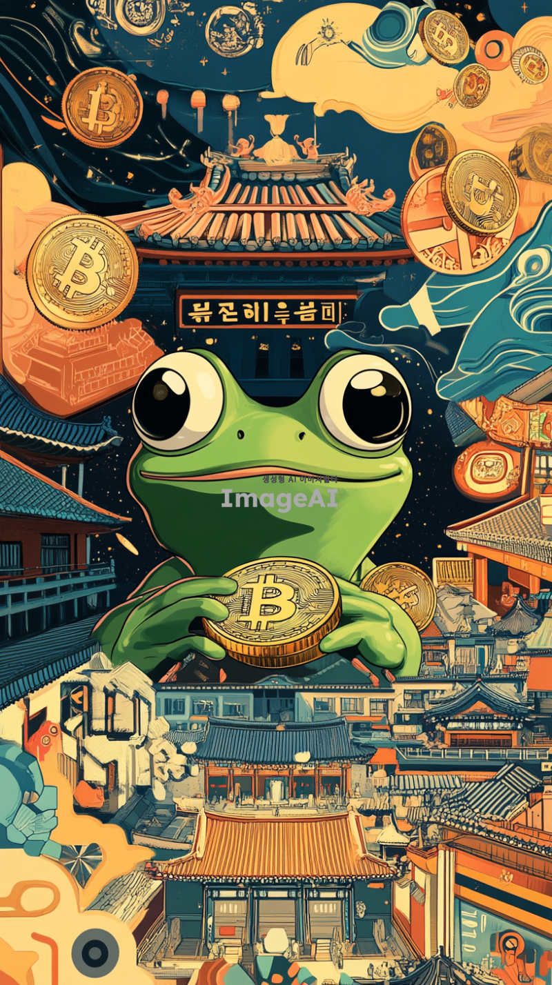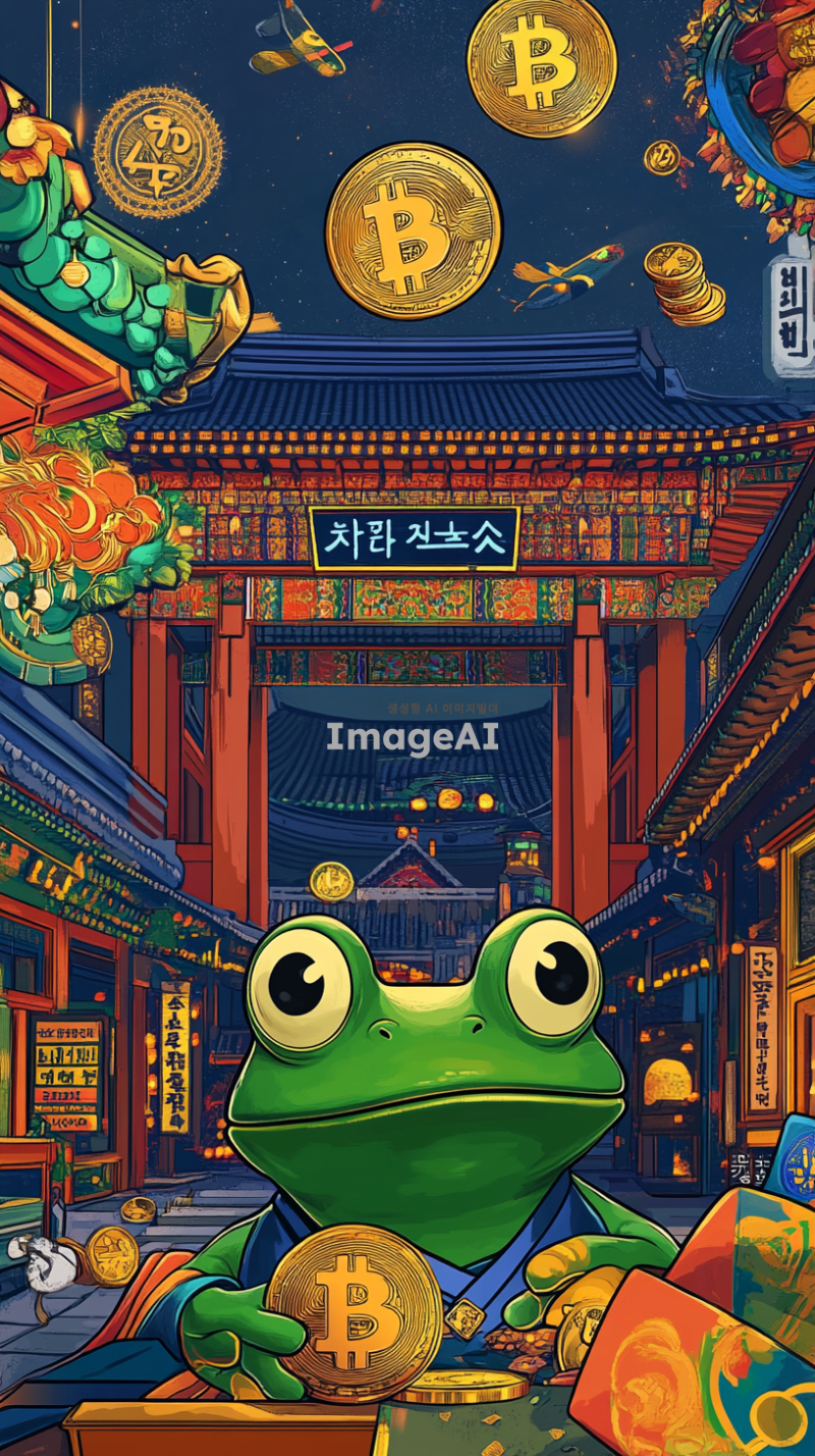 밝고 희망적인 분위기의 그래픽, 페페 개구리가 한국 전통 시장에서 코인 거래를 하는 모습, 주변에 다양한 암호화폐 상징들이 함께 있는 장면, 경제 성장과 번영을 상징하는 요소들 포함, 한국 전통 문양과 현대적인 금융 기술이 조화를 이루는 배경.