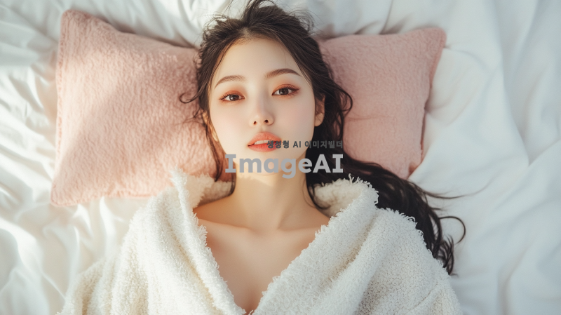 화이트배경, 흰색 침대에 누워있는 아시아 젊고 예쁜여성, 상체만 보임, 흰색 목욕 가운 입고있음, 분홍색 배개, 침대커버 침구류가 살짝 보임