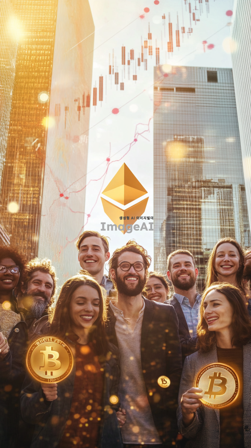 리플코인이 상승하는 장면을 표현한 이미지. 배경은 현대적인 금융도시의 스카이라인, 하늘은 맑고 밝은 햇살이 비추고 있으며, 코인 그래프가 급상승하는 모습. 그래프 옆에는 리플 로고가 빛나고 있고, 주변에는 코인을 들고 환하게 미소 짓는 다양한 연령대의 사람들이 모여 있는 장면. 사람들은 비즈니스 캐주얼 복장을 하고 있으며, 긍정적이고 희망적인 분위기를 강조.