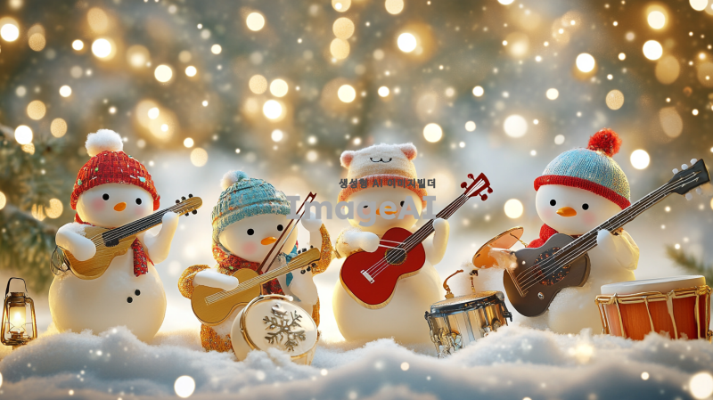 겨울 축제 분위기의 눈 덮인 배경, 각기 다른 귀여운 모자를 쓴 5명의 한국인 눈사람, 각각 기타, 바이올린, 드럼, 플루트, 피아노 같은 다양한 악기를 연주하며 웃고 있는 모습, 주변에는 반짝이는 조명과 작은 눈송이가 흩날리는 장면, 따뜻하고 아늑한 분위기, 밝고 생동감 넘치는 색감.