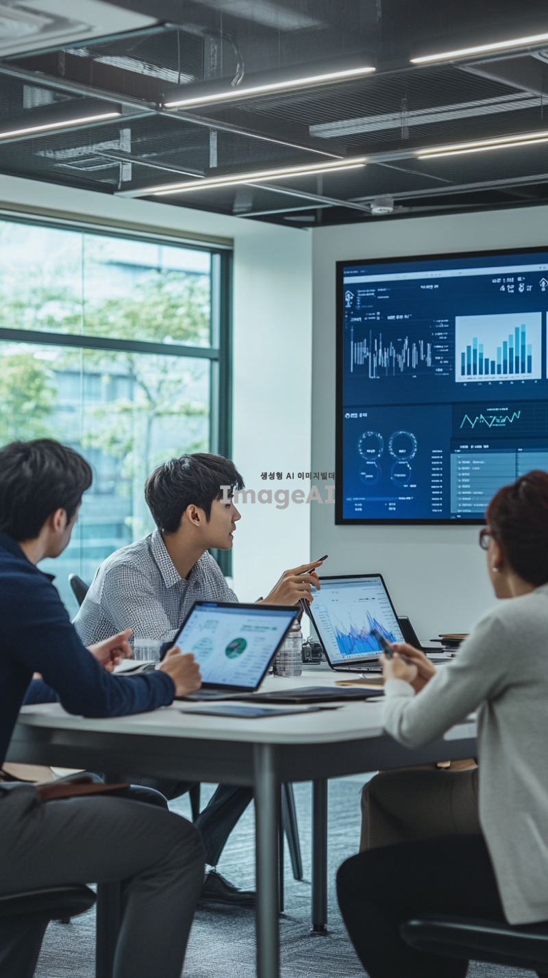 현대적인 사무실 환경에서 여러 명의 한국인 전문가들이 회의 테이블에 둘러앉아 노트북과 태블릿을 사용하여 암호화폐 시장을 분석하고 있는 장면. 벽에는 큰 스크린이 설치되어 있으며, 다양한 그래프와 차트가 표시되어 있다. 전문가들은 서로 토론하며 메모를 작성하고 있으며, 각자의 노트북 화면에는 복잡한 데이터와 분석 도구가 열려 있다. 배경은 깔끔하고 정돈된 사무실 인테리어로, 창문을 통해 자연광이 들어와 밝고 쾌적한 분위기를 연출하고 있다.