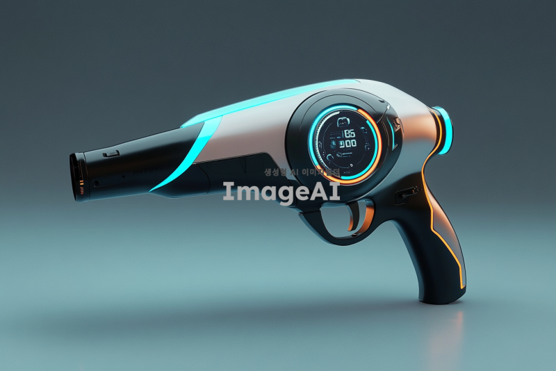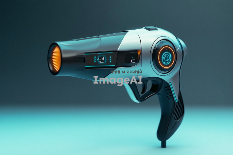 미래적인 디자인의 헤어드라이어, 오버워치 게임의 트레이서 무기에서 영감을 받은 스타일, 날렵하고 역동적인 형태, 에너제틱한 오렌지와 하늘색 조명 효과, 첨단 기술 느낌을 주는 디지털 디스플레이, 인체공학적 손잡이, 공기역학적 디자인 요소, 고급스러운 금속 질감과 세련된 마감 처리.