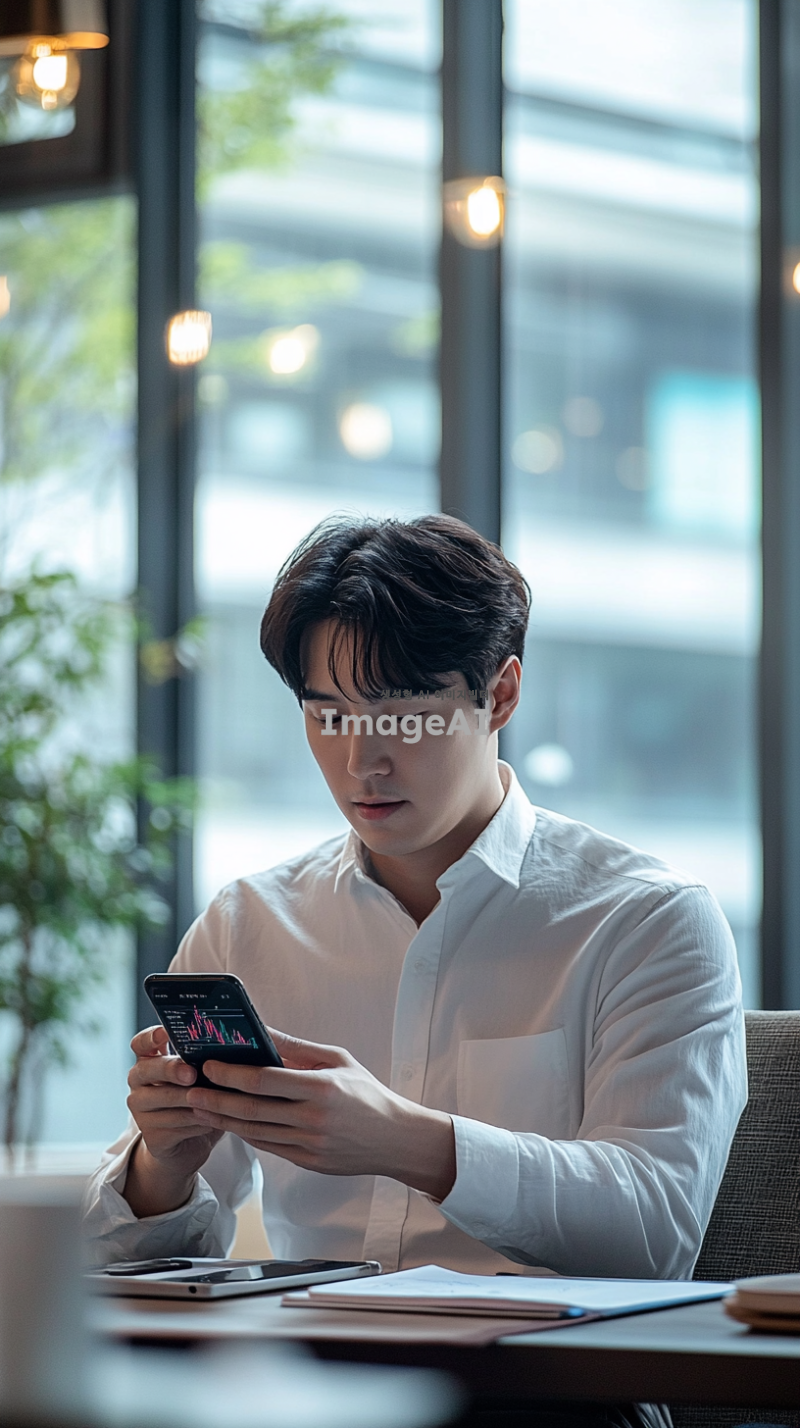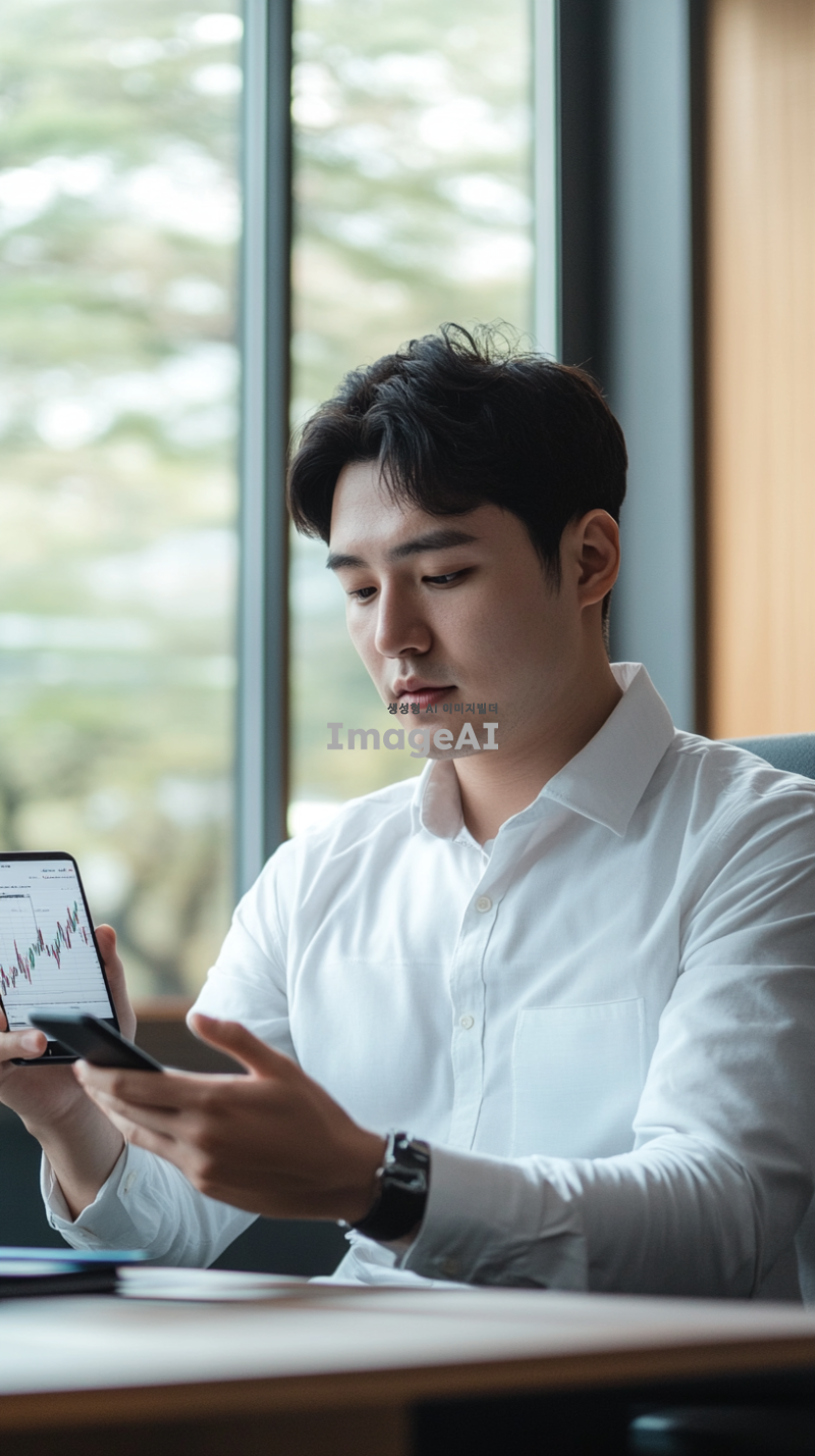 현대적인 사무실에서 창문을 배경으로 책상에 앉아 있는 한국인 남성, 집중한 표정으로 휴대폰을 들여다보며 차트를 분석하는 모습, 휴대폰 화면에 선명하게 보이는 상승하는 코인 차트, 차트의 세부사항이 강조된 화면, 차분하고 전문적인 분위기, 자연광이 부드럽게 비치는 실내, 남성은 비즈니스 캐주얼 복장을 하고 있음.