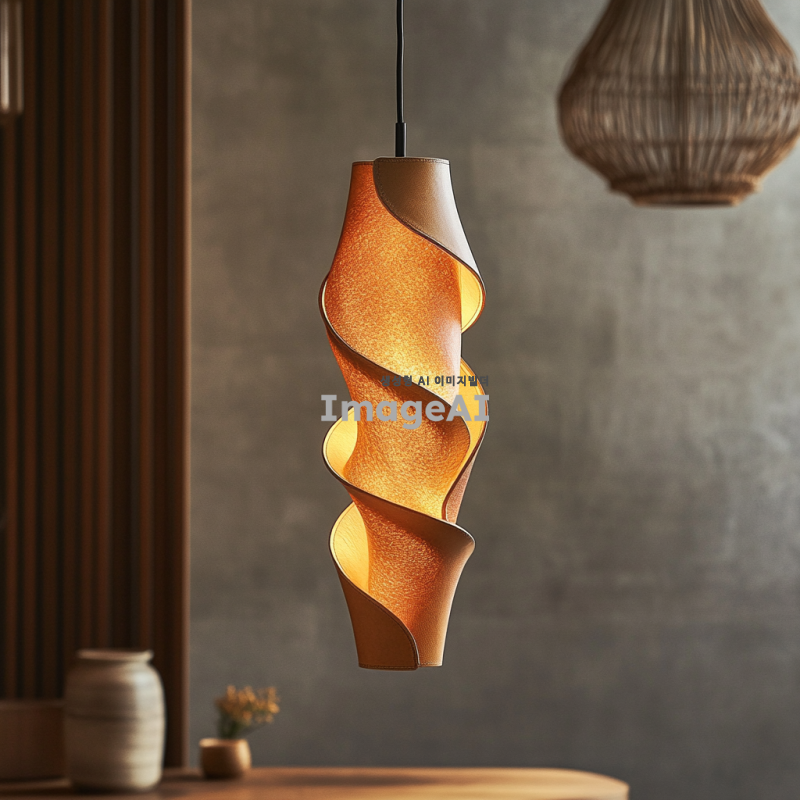 따뜻한 분위기를 연출하는 한국 전통 문양이 새겨진 현대적인 가죽 조명 디자인, 부드러운 갈색 가죽 소재, 은은한 노란빛이 퍼지는 조명, 자연스러운 질감, 세련되고 우아한 실루엣, 실내 인테리어에 어울리는 크기와 형태, 장인의 손길이 느껴지는 정교한 디테일, 현대적인 공간에 조화롭게 어우러지는 스타일.