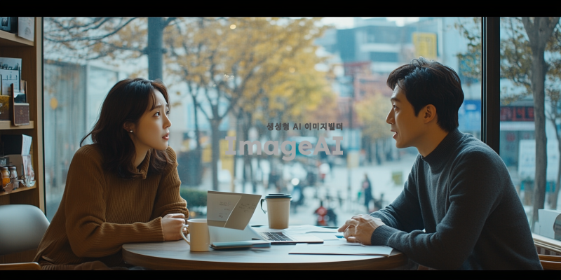 현대적인 카페 내부, 창가에 앉아 대화를 나누고 있는 두 명의 한국인. A는 약간 피곤한 표정으로 테이블에 팔꿈치를 올리고 있으며, B는 놀란 표정으로 A를 바라보고 있다. 주변에는 커피잔과 노트북, 노트 등이 놓여 있어 바쁜 일상과 업무의 분위기를 연출. 창문 밖으로는 바쁜 도시의 거리 풍경이 보이며, 따뜻한 조명 아래 카페의 아늑한 분위기가 느껴진다.
