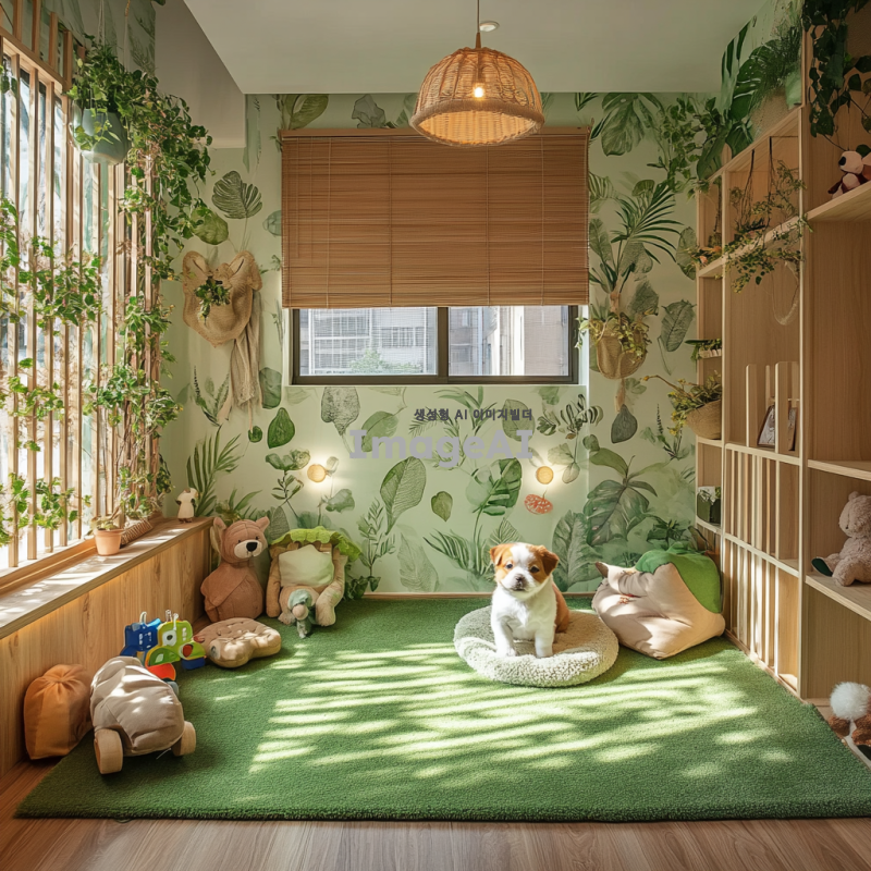 강아지가 편안하게 쉴 수 있는 자연 모티브의 인테리어 디자인, 그린 톤의 벽지와 식물 장식, 나무 소재의 가구로 꾸며진 방, 바닥에는 부드러운 녹색 카펫이 깔려있고, 강아지가 가지고 놀 수 있는 다양한 인형 장난감이 놓여있는 깔끔하고 아늑한 공간, 창문을 통해 자연광이 들어오는 따뜻한 분위기.