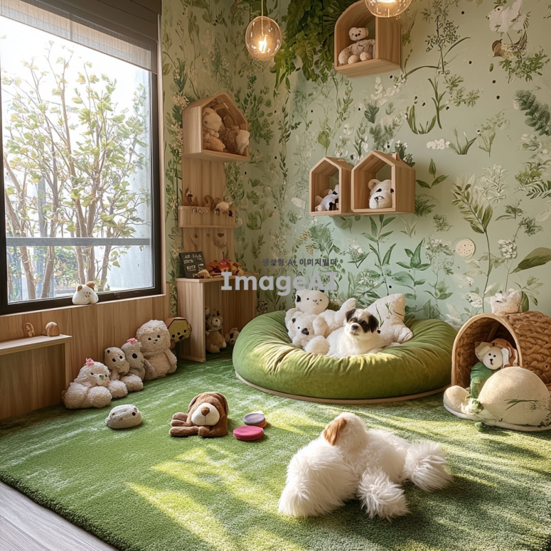 자연을 모티브한 인테리어로 강아지가 편안하고 쉴 수 있는 강아지방 그린인테리어로 강아지가 가지고 놀 수 있는 인형장난감, 깔끔하고 편안한 강아지방