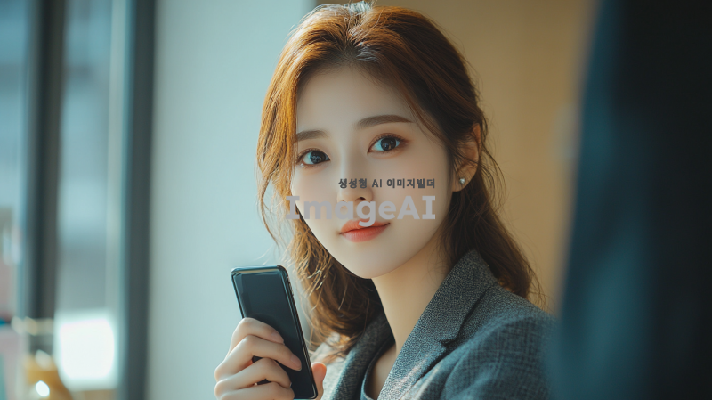 밝고 친절한 표정의 한국 여성, 휴대폰을 손에 들고 있는 모습, 깔끔한 비즈니스 캐주얼 복장, 부드러운 조명 아래에서 촬영된 듯한 느낌, 배경은 심플하고 전문적인 분위기의 오피스 환경, 신뢰감을 주는 따뜻한 색조.