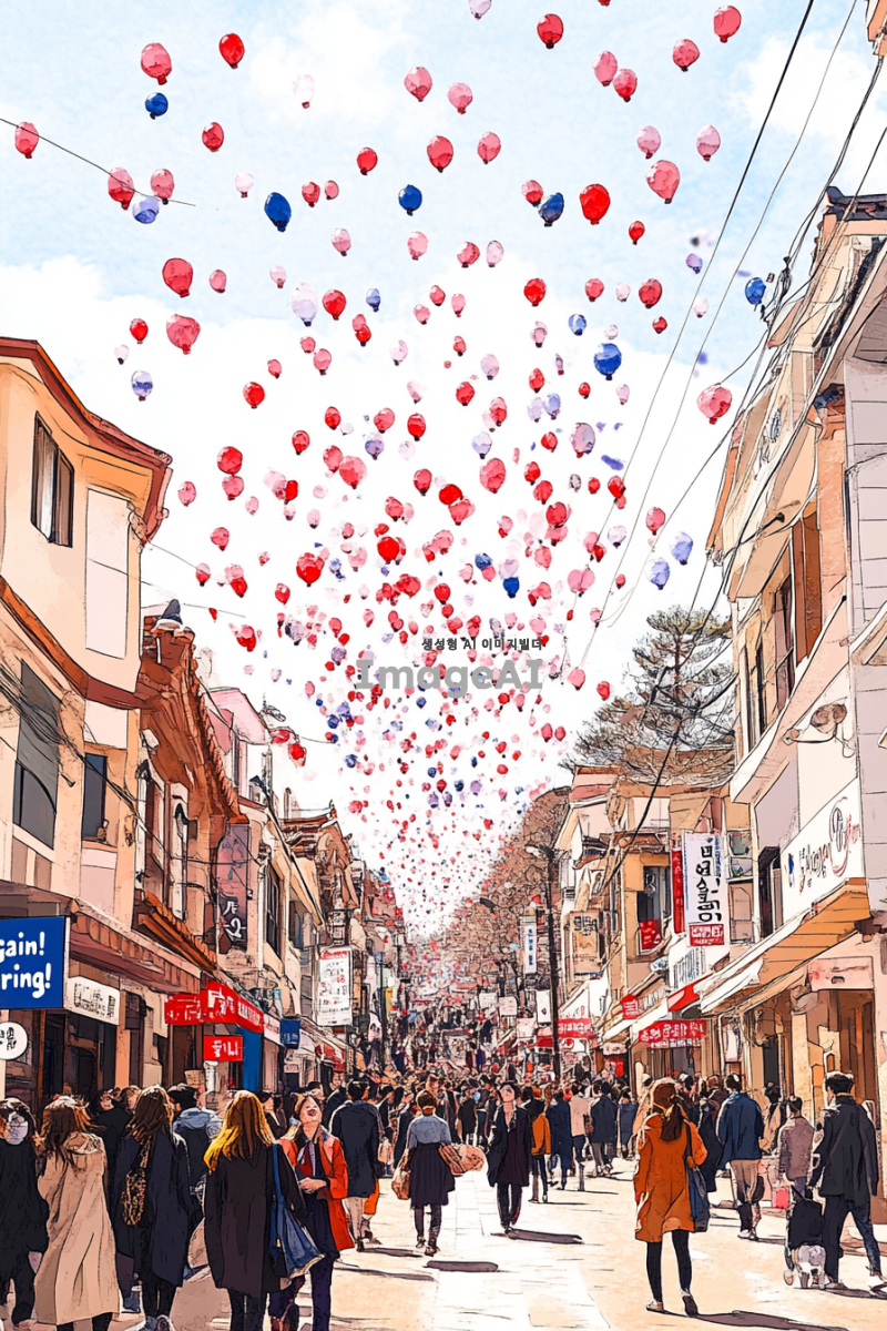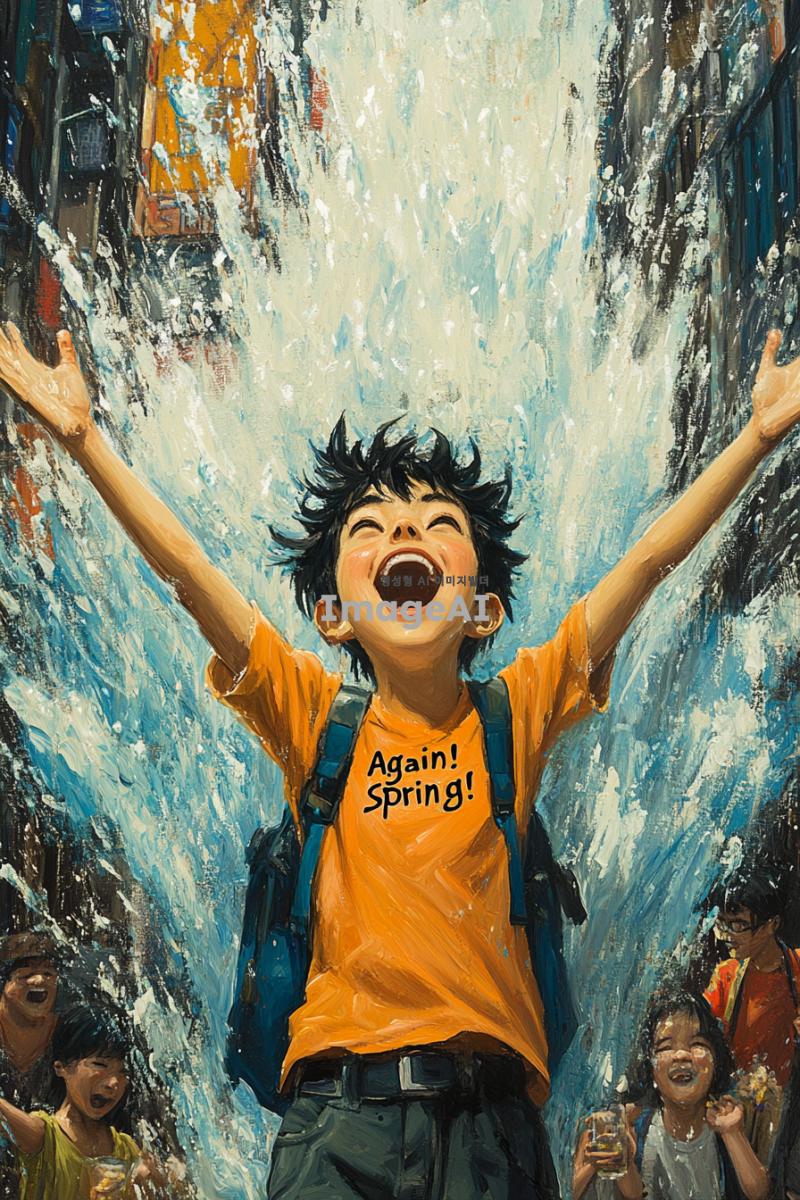 안산국제거리극축제의 활기찬 분위기를 담은 거리 예술가들이 공연하는 모습, 다양한 색상의 화려한 거리와 축제의 에너지를 표현. "다시! 봄!"이라는 슬로건을 강조하여 포스터 중앙에 배치, 봄의 생동감과 새로움을 상징하는 요소들, 예를 들어 꽃, 나무, 밝은 햇살 등을 배경에 포함. 한국 전통 예술과 현대적 감각이 조화를 이루는 디자인, 다양한 연령대의 사람들이 함께 즐기는 모습을 표현하여 모두가 참여할 수 있는 축제의 포용성을 강조.
