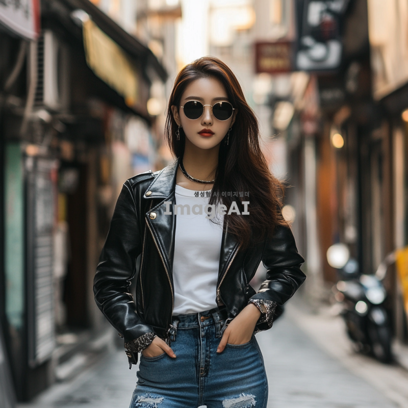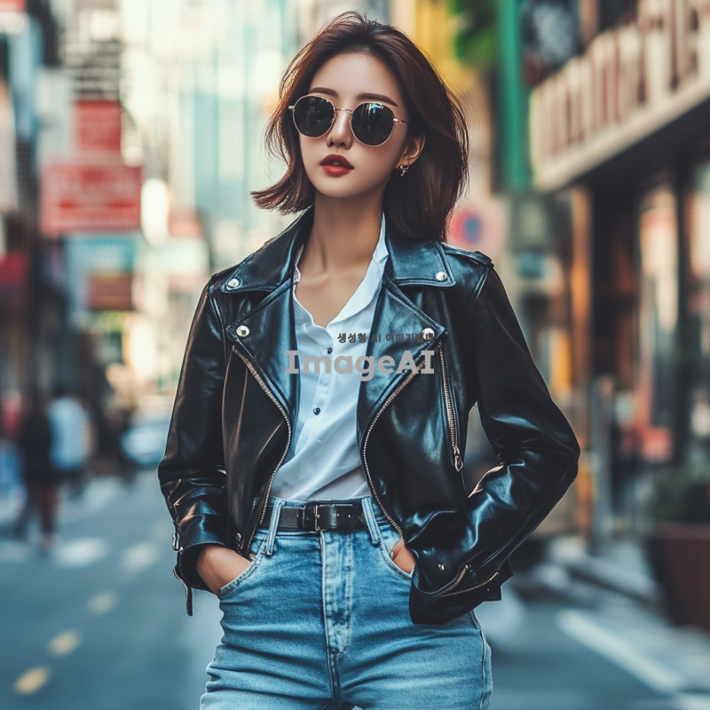 도시 거리에서 포즈를 취하는 세련된 한국 여성, 최신 패션 트렌드를 반영한 스타일리시한 옷차림, 청바지와 화이트 셔츠, 블랙 가죽 재킷, 선글라스를 착용하고 있으며, 배경은 현대적인 도시 풍경, 자연스러운 조명과 함께 활기찬 분위기.