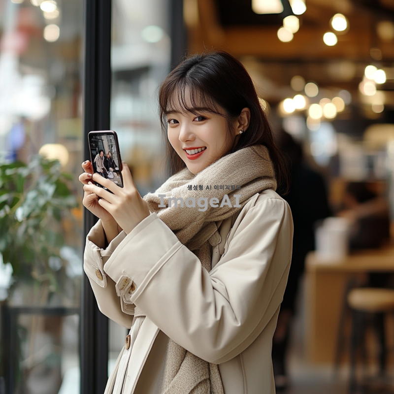 현대적인 한국 여성, 세련된 도시 배경에서 다양한 패션 스타일을 시도하는 모습, 캐주얼한 일상복부터 세련된 오피스룩까지 다양한 의상, 밝고 자연스러운 미소, 스마트폰으로 사진을 찍는 모습, SNS에 올릴 사진을 고르는 장면, 자연광이 비치는 카페나 거리에서의 일상적인 순간, 패션과 일상을 즐기는 현대적인 라이프스타일, 트렌디한 액세서리와 소품, 여유롭고 활기찬 분위기.