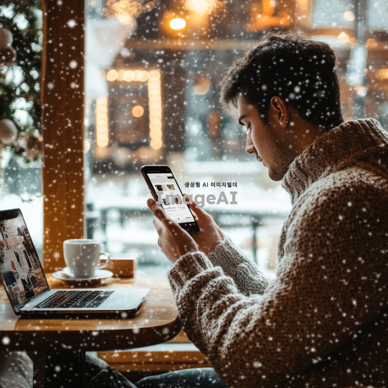 젊은 남자가 스마트폰을 들고 패션 어플리케이션을 탐색하며 겨울 코트를 비교하는 장면. 그는 따뜻한 카페 안에 앉아 있으며, 창밖으로 눈이 내리는 겨울 풍경이 보인다. 남자는 캐주얼한 니트 스웨터를 입고 있으며, 테이블 위에는 커피잔과 노트북이 놓여 있다. 주변에는 모던한 인테리어와 아늑한 조명이 분위기를 더한다.