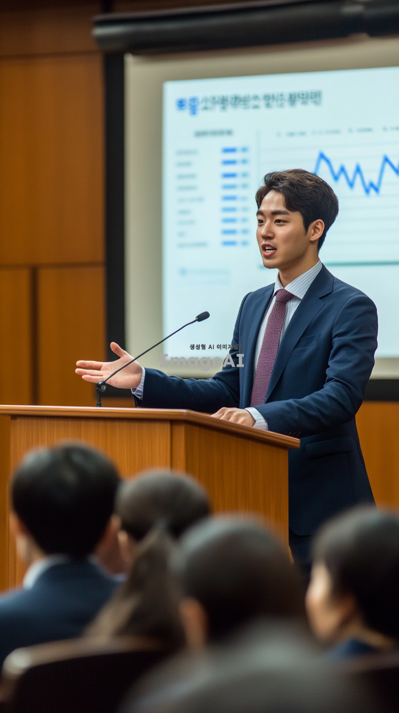 강의실에서 연단에 서서 차트를 보며 고개를 좌우로 흔들며 반대의견을 표하는 한국인 연설자, 비즈니스 정장 차림, 강의실 배경, 차트는 그래프 형태로 화면에 표시, 청중은 흐릿하게 표현.