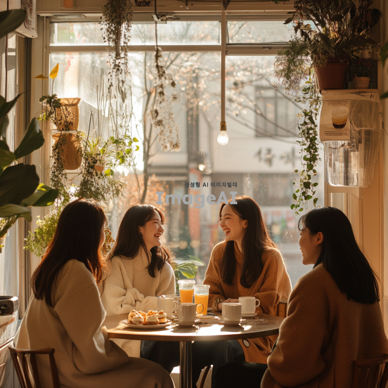 따뜻하고 아늑한 분위기의 카페 내부, 창문으로 부드러운 햇살이 들어오는 장면. 테이블에 앉아 있는 다섯 명의 한국인 여성들이 서로를 바라보며 웃고 있다. 각자의 스타일이 돋보이는 캐주얼한 옷차림을 하고 있으며, 테이블 위에는 커피잔과 디저트가 놓여 있다. 주변에는 식물과 아기자기한 장식들이 배치되어 있어 편안한 느낌을 준다. 자연스러운 표정과 포즈로 서로 대화하는 모습.