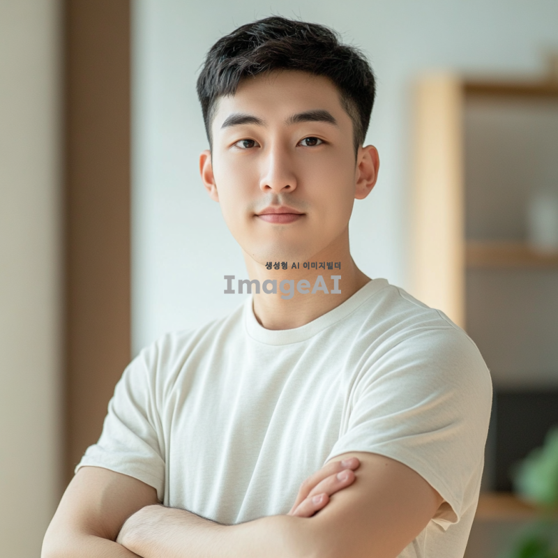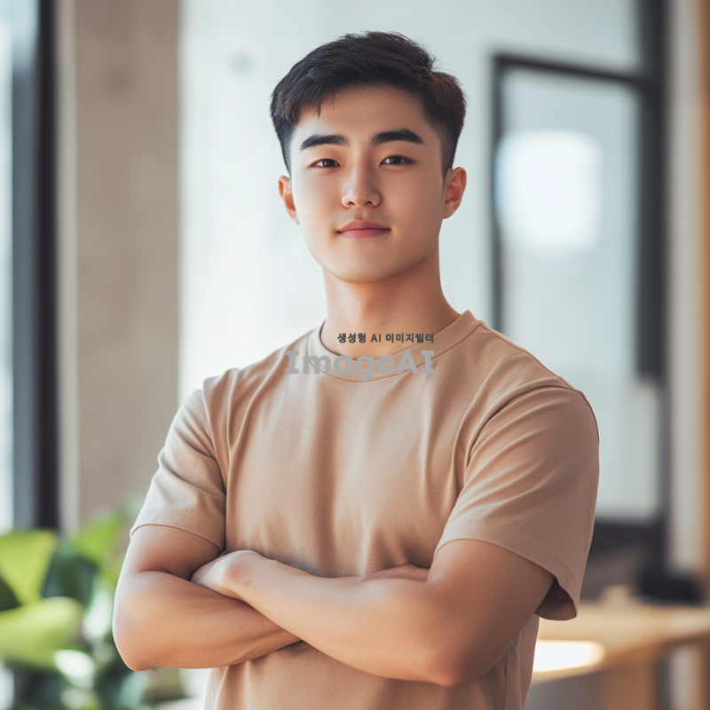 건장하고 믿음직스러운 이미지의 짧은 머리를 가진 한국 남성이 팔짱을 끼고 서 있는 모습, 반팔 티셔츠를 입고 있으며, 배경은 부드러운 색조의 단순한 디자인으로 설정. 남성의 표정은 자신감 있고 친근한 느낌을 주며, 자연스러운 조명 아래에서 촬영된 듯한 분위기.