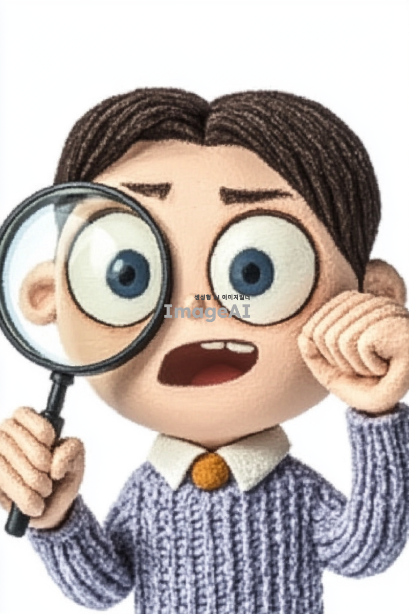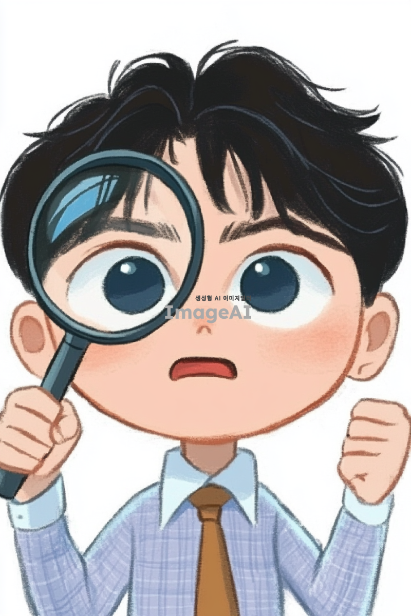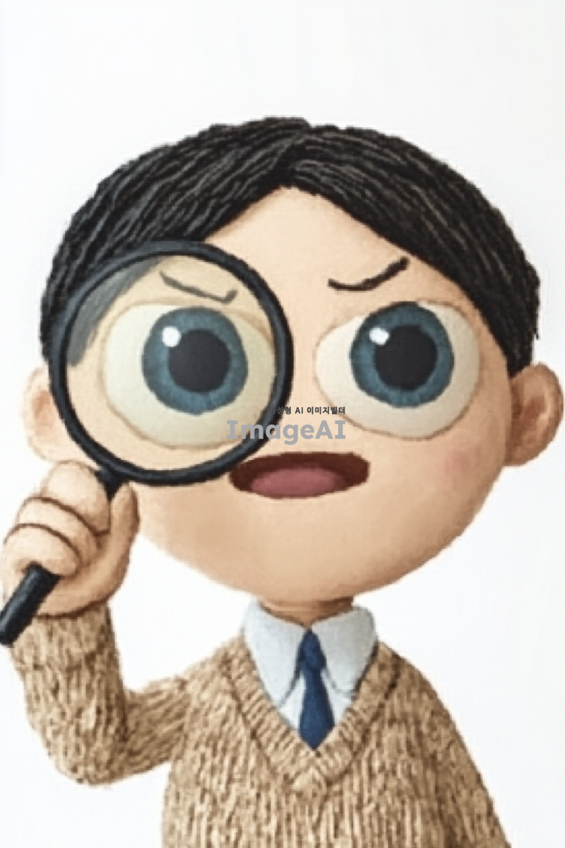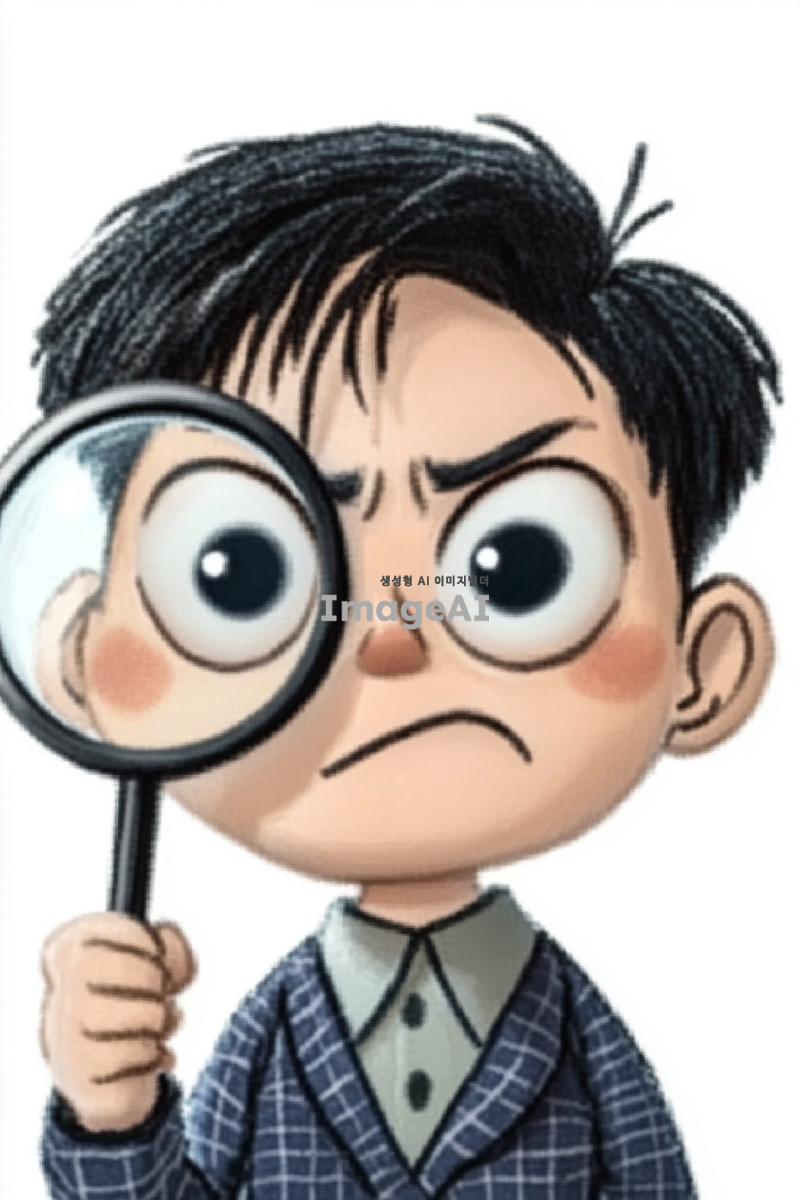 흰색 배경에 자기 얼굴의 10배 큰 돋보기를 한 쪽 눈에 대고 화면 밖을 바라보고 있는 눈이 작은 학생 캐릭터