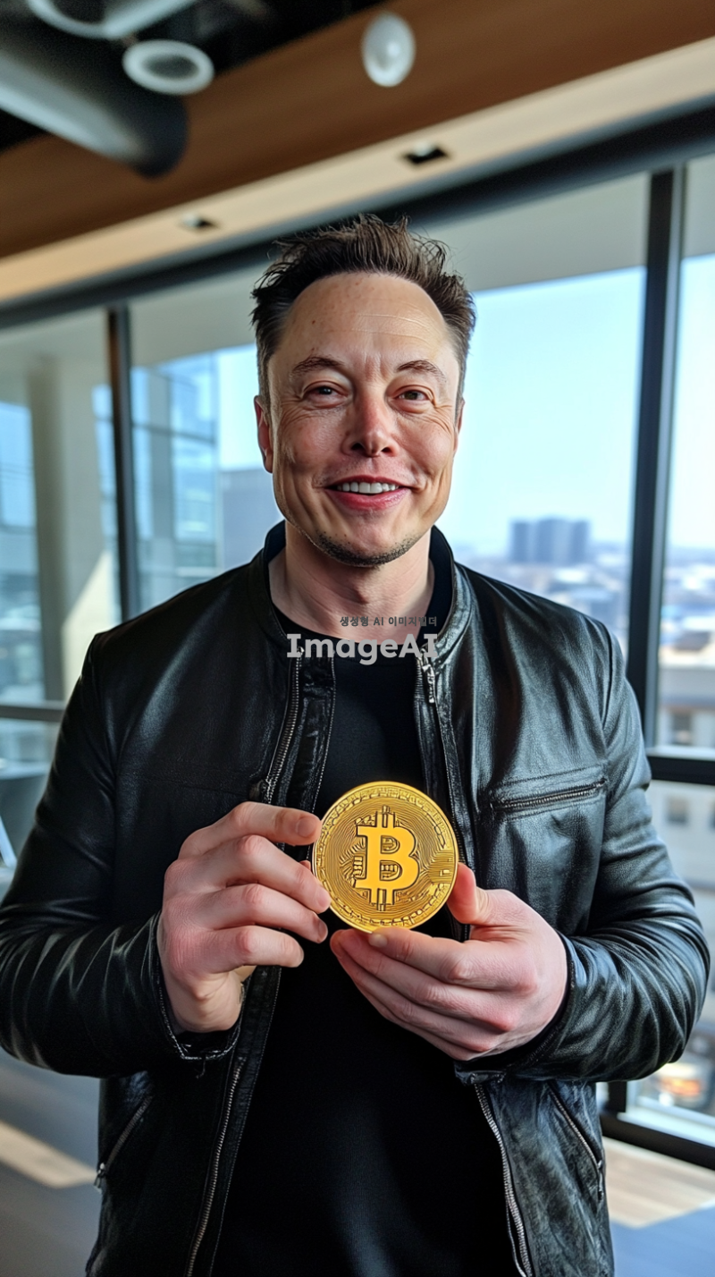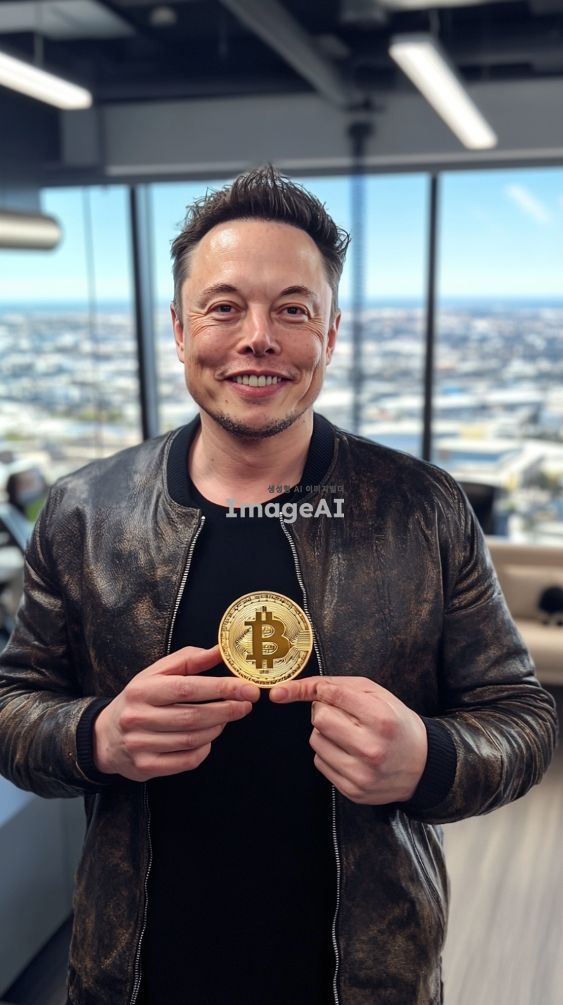 일론 머스크가 도지코인 로고가 있는 동전을 손에 들고 있는 모습, 배경은 현대적인 오피스, 창밖으로는 도시의 전경이 보이는 장면, 일론 머스크는 캐주얼한 옷차림, 미소를 짓고 있음, 밝고 미래지향적인 분위기.