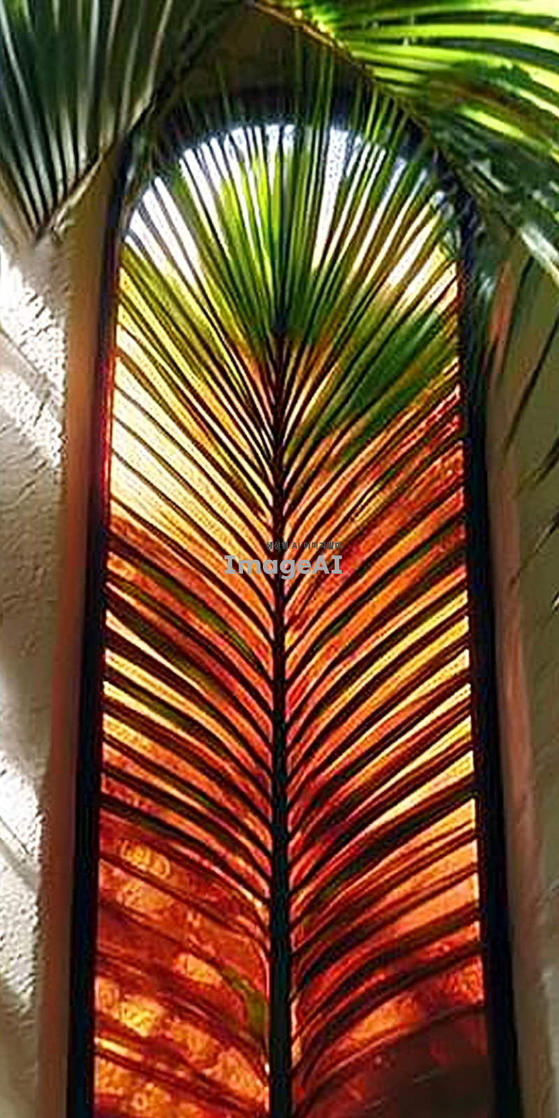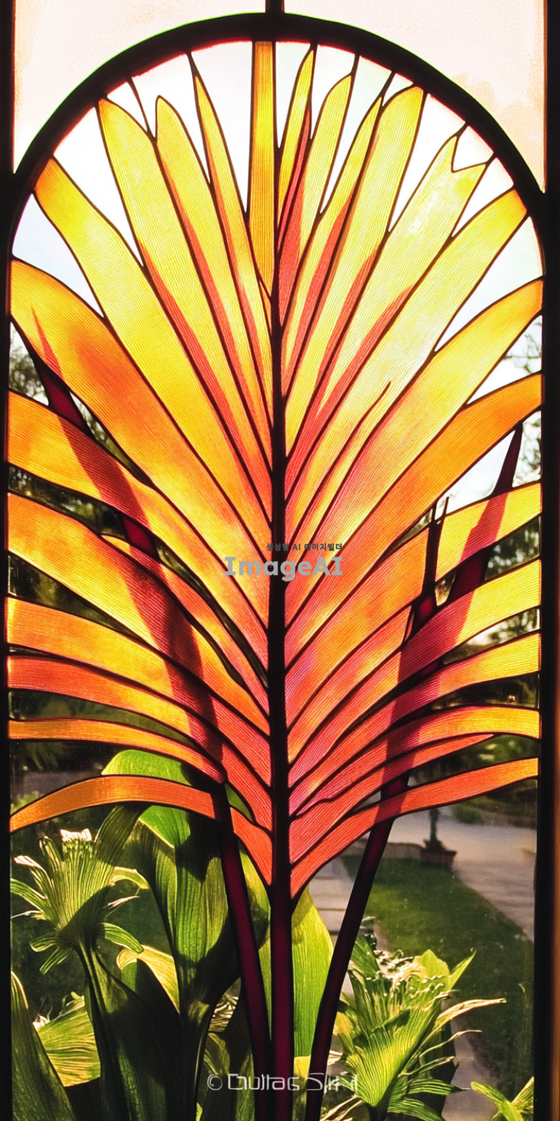 종려잎을 현대적으로 해석한 스태인드글라스, 단순화 한 기하학적 문양, 테두리 선은 굵게, 아래는 진하게 위로 갈수록 연하게 그라데이션, 색감이 돋보이는 디자인, 고풍스러운 느낌의 작품