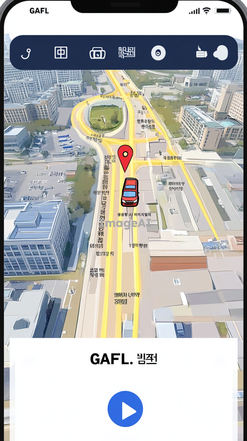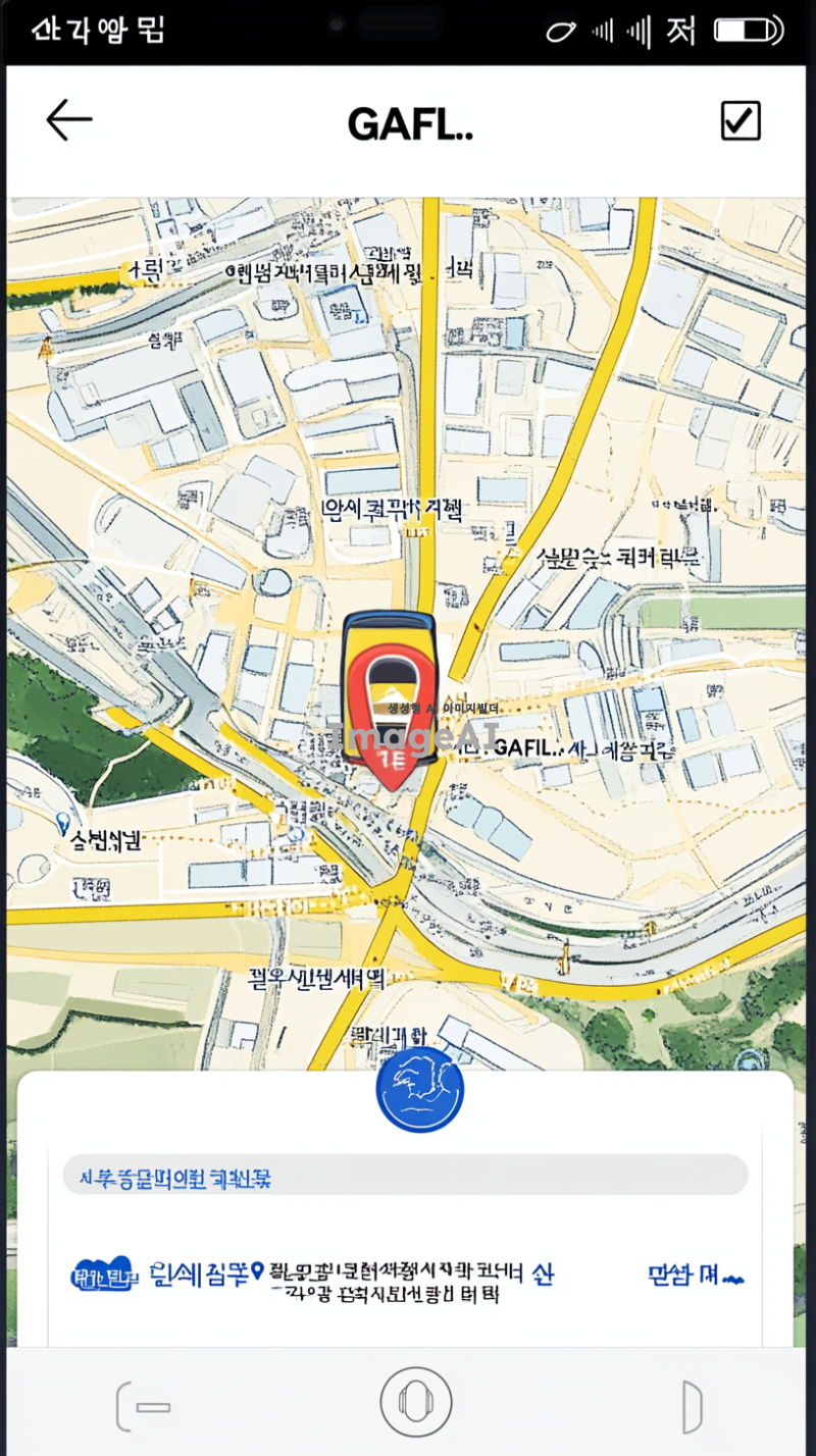 일단 흔히 지도 어플에서 볼 수 있는 듯한 디지털 느낌으 지도에서 학교가 있는데 그 학교 이름은 경기외고야. 경기외고를 지도에서의 현위치로 잡고 셔틀버스가 지도위에 아이콘으로 10분거리에 있어. 지도에는 버스 아이콘이 경기외고 즉 GAFL을 향해 달려오고 있어. 마치 택시어플에서 택시 기사가 10분뒤 도착한다는 화면처럼 경기외국어고등학교를 현위치로 잡고 버스 어플을 그려줘. 그치만 버스 아이콘은 빨간색과 노란색이 섞여있고 봉황이 위에 올라가 있었으면 좋겠어. 핸드폰 지도 처럼 나타내주고. 페인팅 느낌이 나지 않도록 주의해줘. 아무튼 학생이 셔틀 버스를 기다리면서 얼마 남았는지 지도로 확인하는 느낌인데 학생이런 요소들 다 빼고 그 휴대폰 안에 있는 지도만 캡처한것 처럼 구현해줘