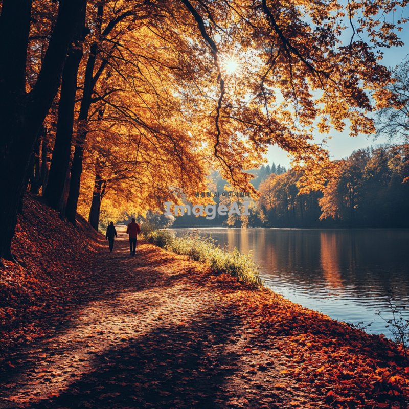 가을의 따뜻한 햇살이 비치는 울긋불긋한 단풍으로 물든 숲길, 바람에 살랑이는 낙엽과 함께 걷는 사람들, 맑고 푸른 하늘 아래 평화로운 분위기, 주변에 호수가 있어 물에 비치는 단풍의 반영, 부드러운 빛과 그림자가 어우러진 장면, 가을의 정취를 느낄 수 있는 풍경.