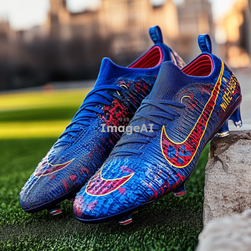 바르셀로나 클럽의 전통적인 색상인 블루와 레드가 조화롭게 디자인된 나이키 축구화, 축구화 측면에 바르셀로나 클럽 로고가 세련되게 배치된 모습, 축구화의 디자인은 현대적이고 역동적인 느낌을 주며, 고급스러운 소재로 제작된 디테일이 돋보이는 모습, 배경은 축구 경기장 잔디 위에 놓인 장면.