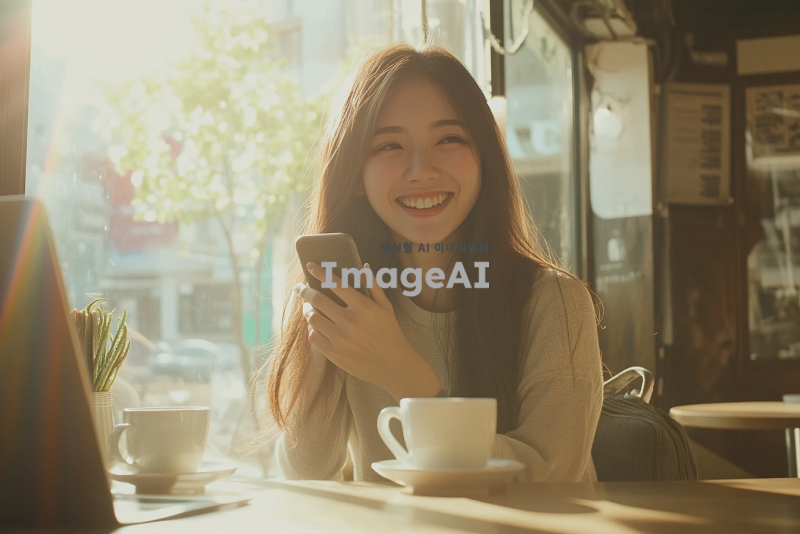 밝은 카페에서 스마트폰을 보고 웃으며 대화하는 20대 초반 여성, 긴 생머리, 캐주얼한 옷차림, 주변에는 커피잔과 노트북, 창밖으로 햇살이 들어오는 장면, 현대적이고 편안한 분위기.