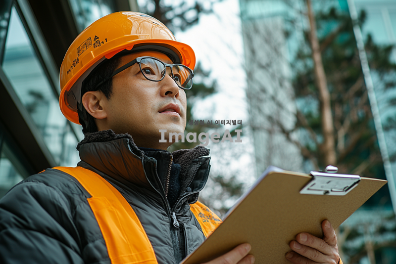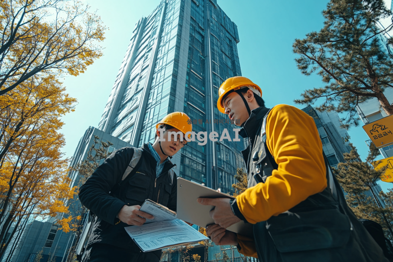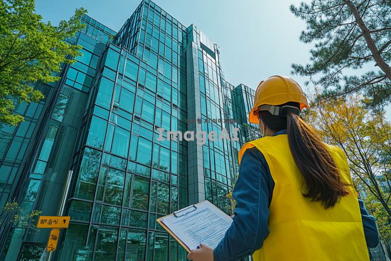 한국도로교통공단 건물의 외부 전경을 배경으로, 안전모를 착용한 전문가들이 석면 위해성 평가를 진행하는 장면. 전문가들은 클립보드와 샘플 채취 도구를 사용하고 있으며, 건물 주변에는 경고 표지판과 안전 장비가 배치되어 있다. 맑은 하늘과 녹색의 나무들이 배경에 어우러져 있으며, 전문가들은 집중된 표정으로 작업 중이다. 건물은 현대적인 디자인으로, 유리와 금속 소재가 조화를 이루고 있다.