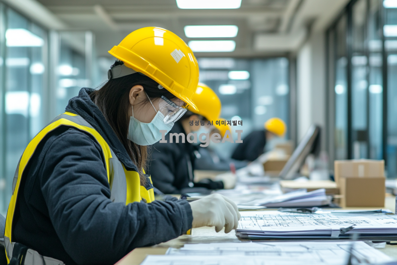 한국도로교통공단의 건축물 내부에서 석면 위해성 평가를 수행하는 장면, 안전모와 보호 마스크를 착용한 전문가들이 석면 샘플을 채취하고 분석하는 모습, 주변에는 건축 도면과 전문 장비들이 놓여 있으며, 현대적이고 깔끔한 사무실 환경, 전문가들은 진지하고 집중된 표정으로 작업에 임하고 있는 장면, 자연광이 들어오는 넓은 창문과 정돈된 공간 배치.