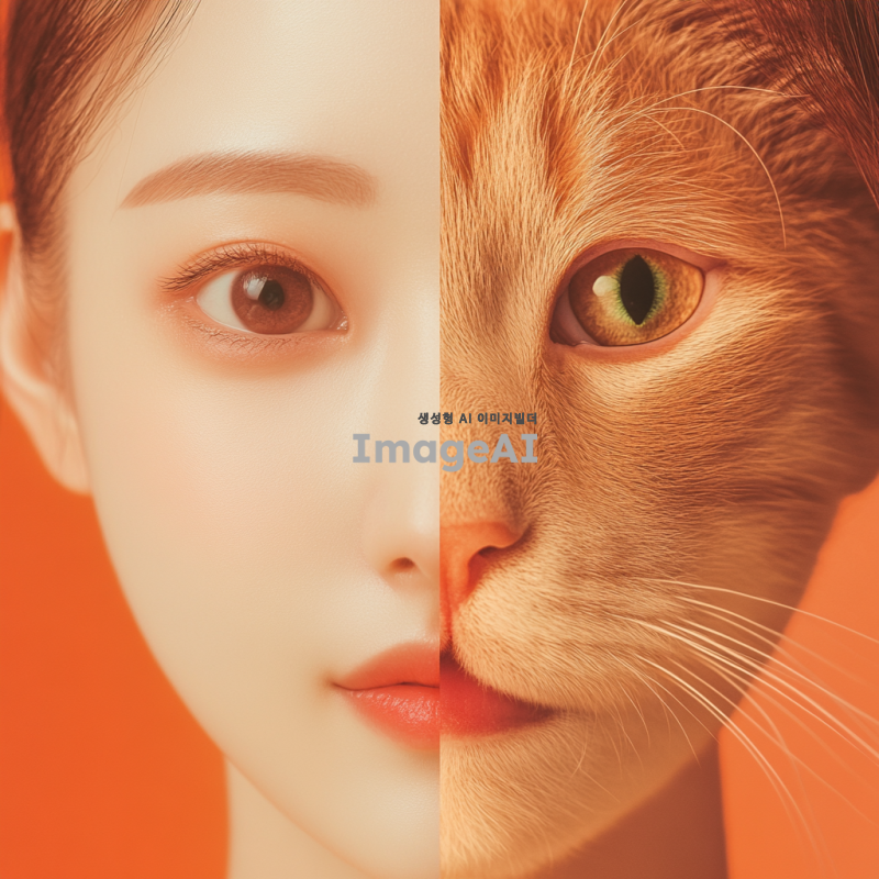 한국인의 얼굴과 고양이 얼굴이 조화롭게 합쳐진 이미지, 부드럽고 자연스러운 전환, 따뜻하고 친근한 표정, 세밀한 디테일로 표현된 털과 피부, 밝고 화사한 배경, 조화로운 색감.