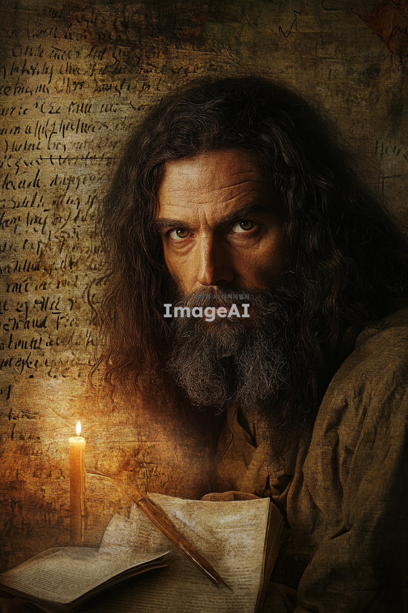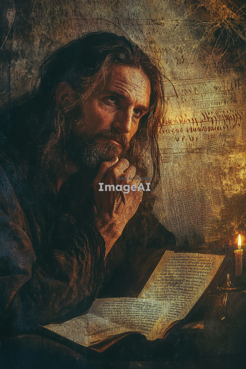 중세 시대의 성경 장면을 배경으로, 깊은 사색에 잠긴 사도 요한. 그의 주변에는 고대의 두루마리와 깃펜이 놓여 있으며, 희미한 촛불이 은은한 빛을 발하고 있다. 요한은 긴 머리와 수염을 가진 모습으로, 그의 눈빛은 지혜와 신비로 가득 차 있다. 배경에는 고대 성경의 구절들이 새겨진 벽이 보이며, 창문을 통해 들어오는 빛이 신성한 분위기를 더해준다.