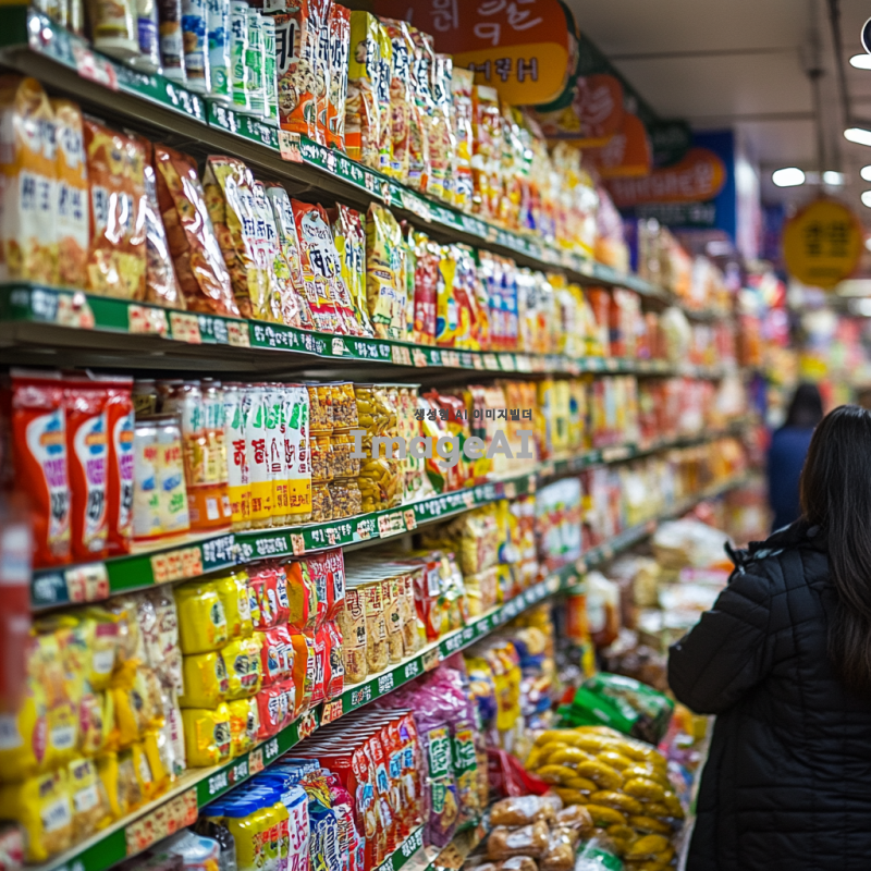 한국의 전통 시장에서 다양한 초가공식품이 진열된 모습, 화려한 색상의 포장지와 다양한 브랜드의 제품들이 선반에 가득 차 있는 장면. 각 제품에는 한글로 적힌 독특한 이름과 설명이 보이며, 시장의 활기찬 분위기와 사람들이 제품을 살펴보는 모습이 함께 표현됨. 다양한 종류의 과자, 음료수, 즉석식품 등이 포함되어 있고, 시장의 전통적인 분위기와 현대적인 제품의 조화가 돋보임.