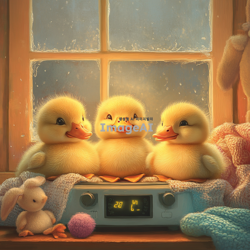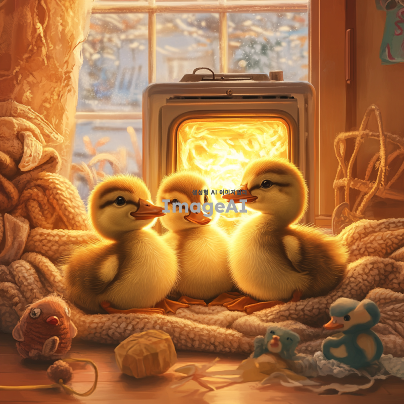 따뜻한 방 안에서 히터를 쬐고 있는 아기 오리 3마리, 아기 오리들은 부드러운 노란색 털을 가지고 있으며, 서로 가까이 모여 앉아 있음, 히터에서 나오는 온기가 아기 오리들을 포근하게 감싸고 있는 모습, 방 안은 아늑하고 편안한 분위기, 아기 오리들의 귀여운 표정과 몸짓이 강조됨, 주변에는 부드러운 담요와 장난감들이 놓여져 있음.