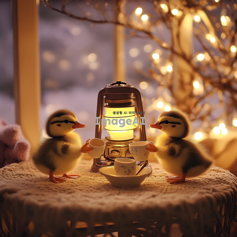 따뜻한 실내 공간에서 아기오리 3마리가 작은 테이블 주위에 모여 앉아 있다. 각 오리는 작은 잔을 들고 있으며, 얼굴에는 즐거운 표정이 가득하다. 테이블 옆에는 히터가 놓여 있어 오리들이 따뜻함을 느끼고 있다. 오리들은 각각 다양한 색의 깃털을 가지고 있으며, 귀엽고 우스꽝스러운 포즈를 취하고 있다. 주변은 아늑하고 편안한 분위기로, 배경에는 부드러운 조명이 비치고 있다.