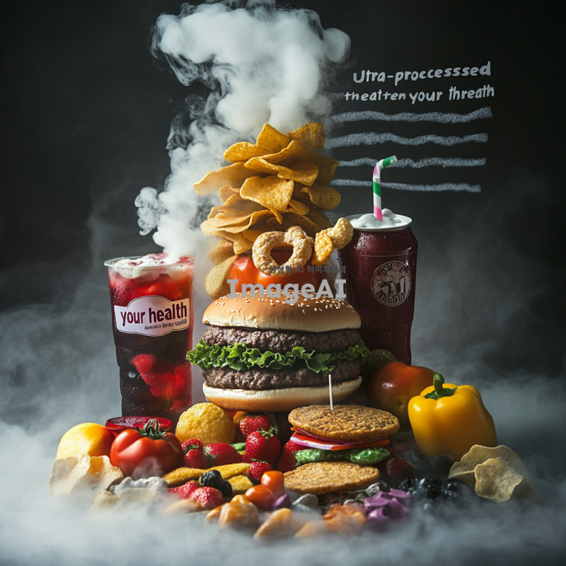 건강에 좋지 않은 초가공식품을 강조하는 이미지, 배경은 어두운 회색 톤, 중앙에 다양한 초가공식품들이 쌓여 있는 모습, 햄버거, 감자칩, 탄산음료, 사탕 등이 포함되어 있으며, 이 음식들 위로 연기가 피어오르는 듯한 효과, 음식들이 점차 녹아내리는 듯한 모습, 주변에 건강을 상징하는 신선한 과일과 채소가 작게 배치되어 대조를 이루는 장면, 이미지 상단에 "초가공식품, 건강을 위협합니다"라는 문구를 굵고 선명한 글씨체로 삽입.