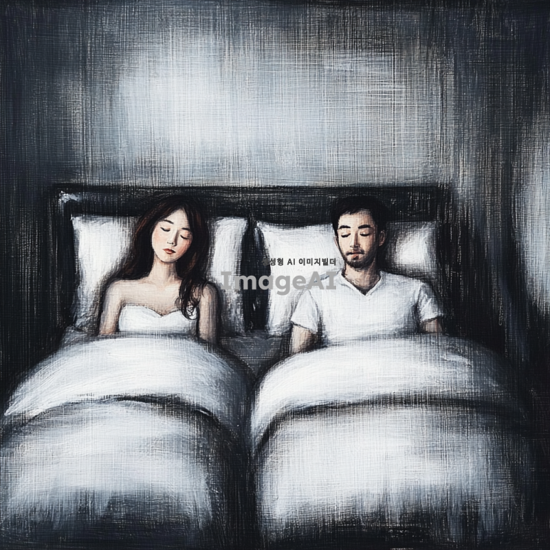 고희 스타일의 유화, 침대에 편안하게 누워 있는 한국인 남녀, 거친 붓터치, 따뜻하고 부드러운 색조, 은은한 빛이 비치는 침실, 세련된 분위기, 감성적이고 평화로운 느낌.