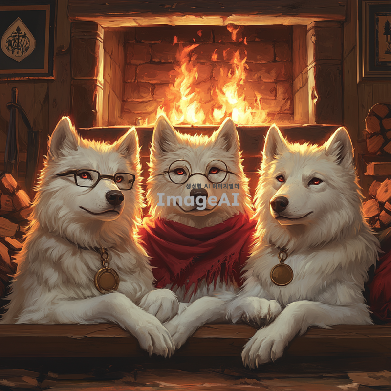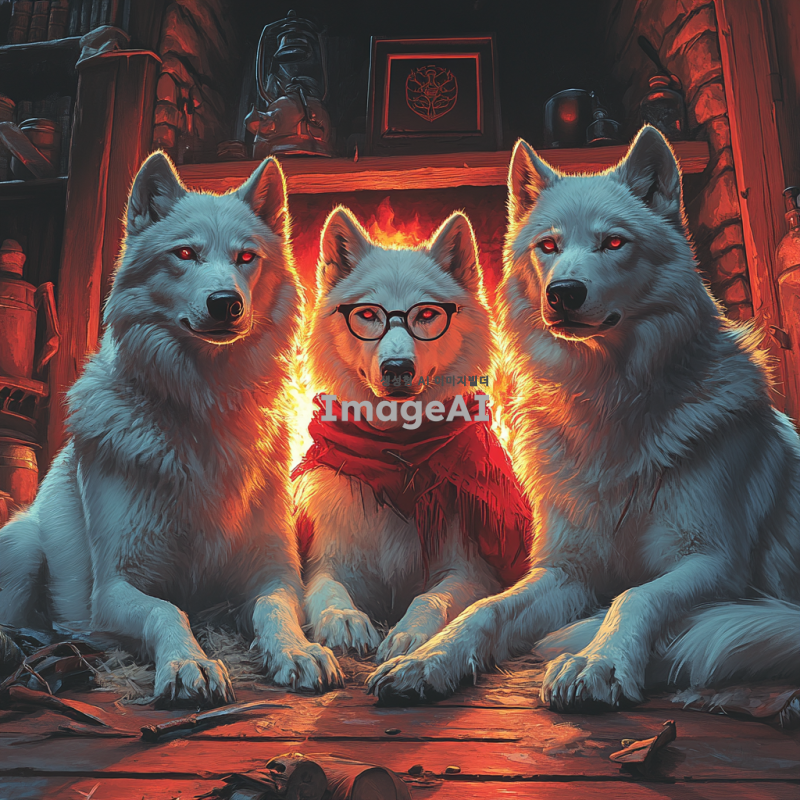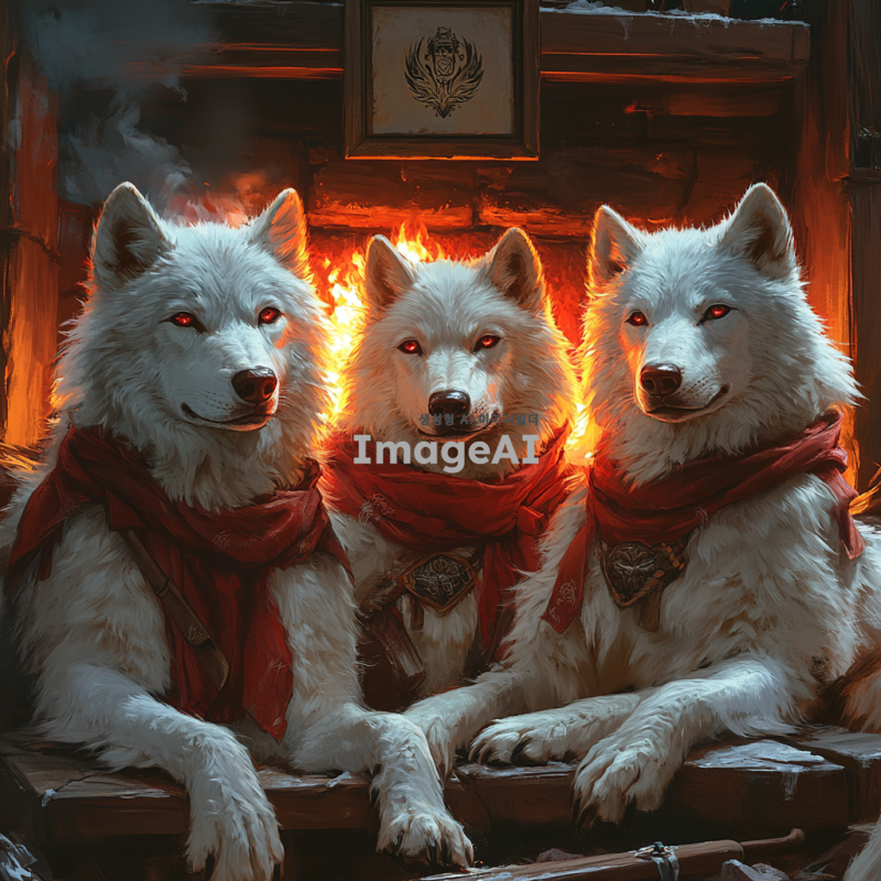 가족으로 보이는 다이아울프 늑대 3마리 다들 털이 하얗고 눈은 빨간색이야. 한 마리는 안경을 썻고 다른 한마리는 빨간 목도리 마지막 한마리는 그냥 있어. 오두막으로 보이는 집에서 난로를 앞에두고 있어. 그들 뒤의 오두막에 액자가 작게 걸려있는데 그건 왕좌의 게임에 나오는 스타크 가문의 문양이 있고 배경은 그냥 평범한 오두막이야. 난로를 앞에 두고 있으니까 얼굴이랑 몸에는 조금의 빨간 빛이 반사되어 나오고 있어