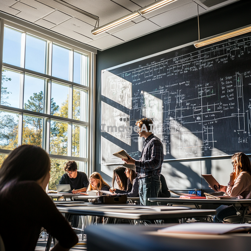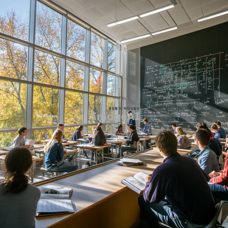 토목환경공학과 강의실에서 학생들이 열심히 공부하고 있는 장면, 커다란 창문을 통해 햇빛이 들어오는 현대적인 강의실, 학생들은 다양한 교과서를 펼쳐놓고 있으며 칠판에는 복잡한 수식과 다이어그램이 그려져 있다, 교수는 앞에 서서 설명하고 있으며 학생들은 노트에 필기하고 있다, 강의실 벽에는 토목공학 관련 포스터와 모형이 전시되어 있다, 학생들은 편안한 옷차림으로 진지하게 강의에 집중하고 있다.