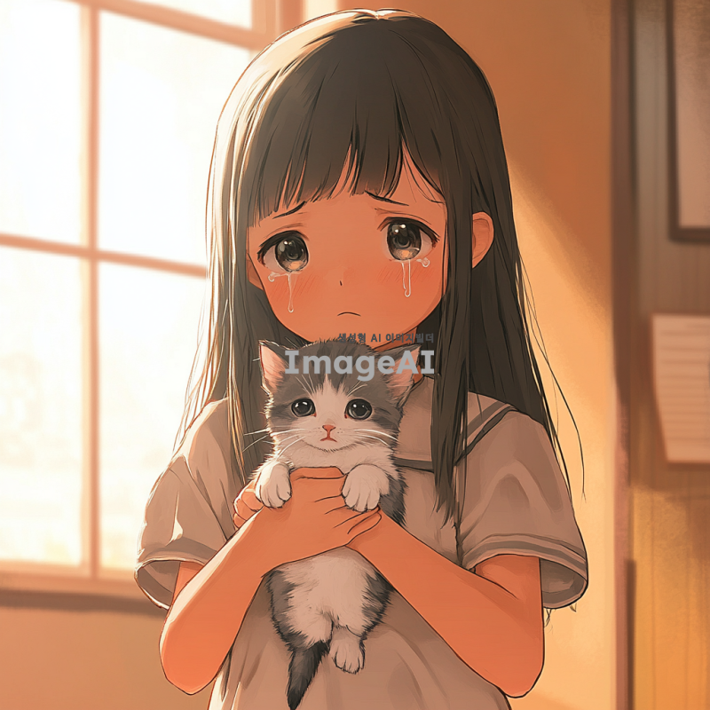 초등학교 여학생이 슬픈 표정으로 작은 새끼 고양이를 안고 있는 모습. 소녀의 눈에는 눈물이 맺혀 있고, 고양이는 부드럽고 약간 지친 모습으로 소녀의 팔에 안겨 있다. 배경은 따뜻한 색감의 실내 공간으로, 소녀와 고양이에게 집중될 수 있도록 단순하게 표현. 소녀는 긴 생머리에 캐주얼한 옷차림을 하고 있으며, 고양이는 회색과 흰색 털을 가진 작고 귀여운 모습.