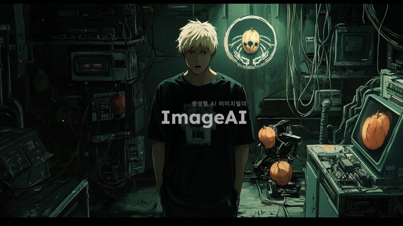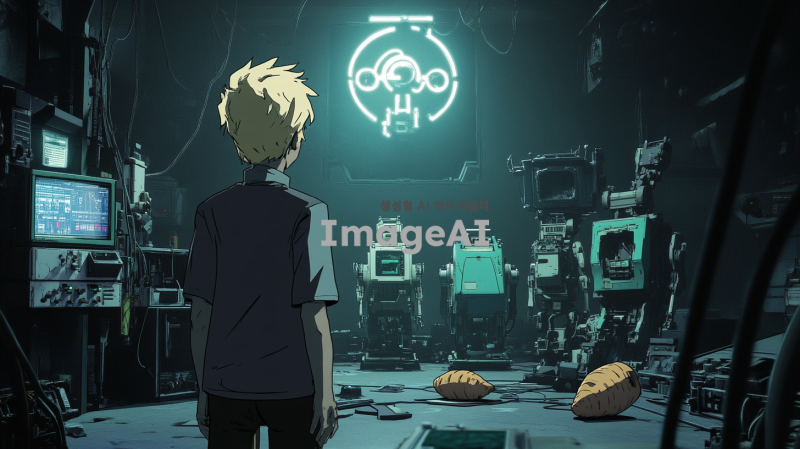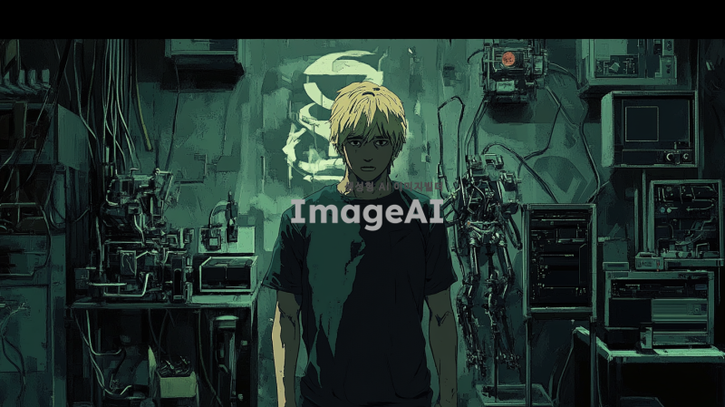 어두운 비밀 실험실 내부, 금발의 남자가 놀란 표정으로 서 있다. 주변에는 복잡한 전자 장치와 반쯤 완성된 고구마 로봇들이 곳곳에 놓여 있다. 실험실은 음침하고 비밀스러운 분위기를 자아내며, 배경에는 조직의 심볼이 희미하게 보인다. 금발의 남자는 진지한 표정으로 로봇들을 바라보고 있으며, 긴장감이 흐르는 장면.