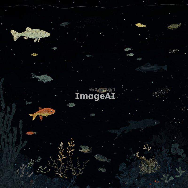 어두운 바다 속, 다양한 물고기들이 헤엄치는 장면. 물고기들은 빛이 거의 없는 깊은 바다 환경에서 서로 흩어져 있어, 그 수가 적어 보인다. 물고기들의 색은 어둡고 희미하며, 주변에는 해초와 산호가 드문드문 보인다. 전체적으로 고요하고 쓸쓸한 분위기를 강조하는 장면.