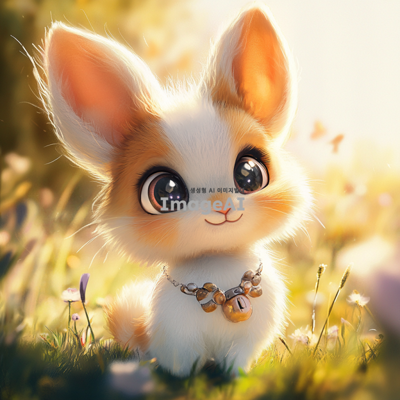 귀여운 토끼 같은 강아지 캐릭터, 큰 귀와 동그란 눈, 부드러운 털, 밝고 활기찬 표정, 작은 코와 입, 파스텔 색상의 털, 귀여운 액세서리로 장식된 목걸이, 초원에서 뛰노는 모습, 따뜻하고 환한 햇살 아래에서 놀고 있는 장면.