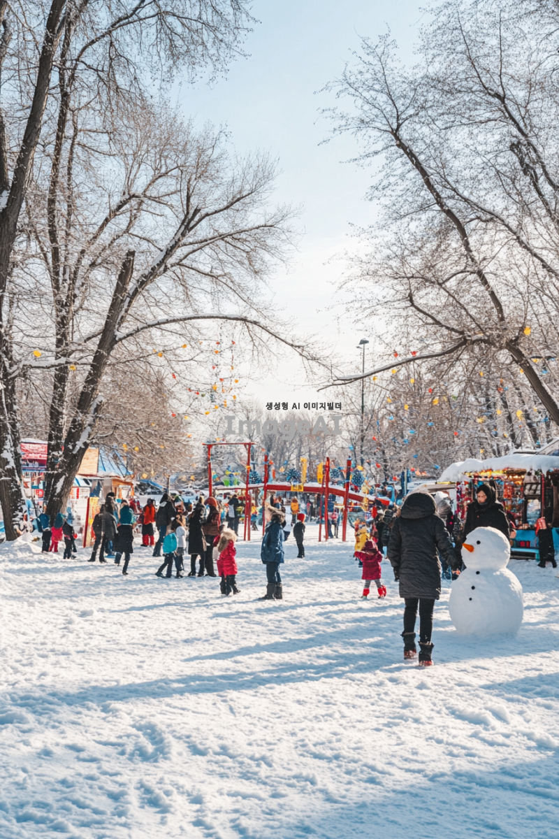 겨울 축제의 활기찬 장면, 눈 덮인 학교 운동장, 눈싸움을 하는 학생들, 눈사람을 만드는 가족들, 따뜻한 코트를 입고 있는 사람들, 축제 장식으로 꾸며진 나무들, 빛나는 조명과 화려한 색상의 겨울 테마 장식, 축제 분위기를 더하는 다양한 부스와 음식점, 뜨거운 코코아를 마시는 사람들, 웃고 즐기는 아이들, 겨울철 스포츠 활동을 즐기는 사람들, 밝고 환한 겨울 하늘, 포근한 겨울의 느낌을 주는 장면.