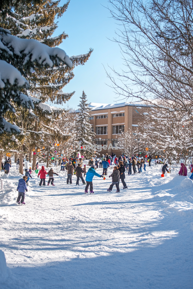눈 덮인 교정에서 학생들이 다양한 겨울 축제를 즐기고 있는 장면. 아이들은 눈싸움을 하거나 눈사람을 만들고 있으며, 일부 학생들은 스케이트를 타고 있다. 교정 곳곳에는 화려한 겨울 장식과 따뜻한 조명이 설치되어 있고, 나무에는 눈이 쌓여 있다. 학생들은 두꺼운 겨울 옷을 입고 있고, 활기차고 즐거운 분위기가 느껴진다. 배경에는 학교 건물이 보이며, 하늘은 맑고 푸르다.