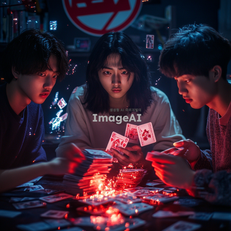 어두운 배경에 카드 게임을 하는 한국인 청소년, 주변에는 신용카드와 게임 카드가 흩어져 있다. 청소년의 얼굴에는 걱정과 불안이 가득하며, 화면의 한쪽에는 커다란 빨간색 경고 표시가 있다. 카드 깡의 위험성을 강조하기 위해 카드가 무너지는 탑처럼 쌓여 있는 모습도 포함되어 있다.